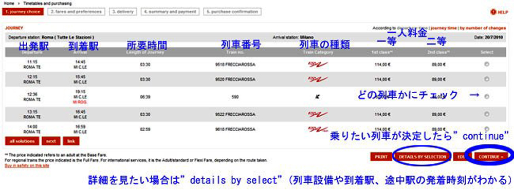 そして列車検索。たとえば、ローマ→ミラノの片道をセット。